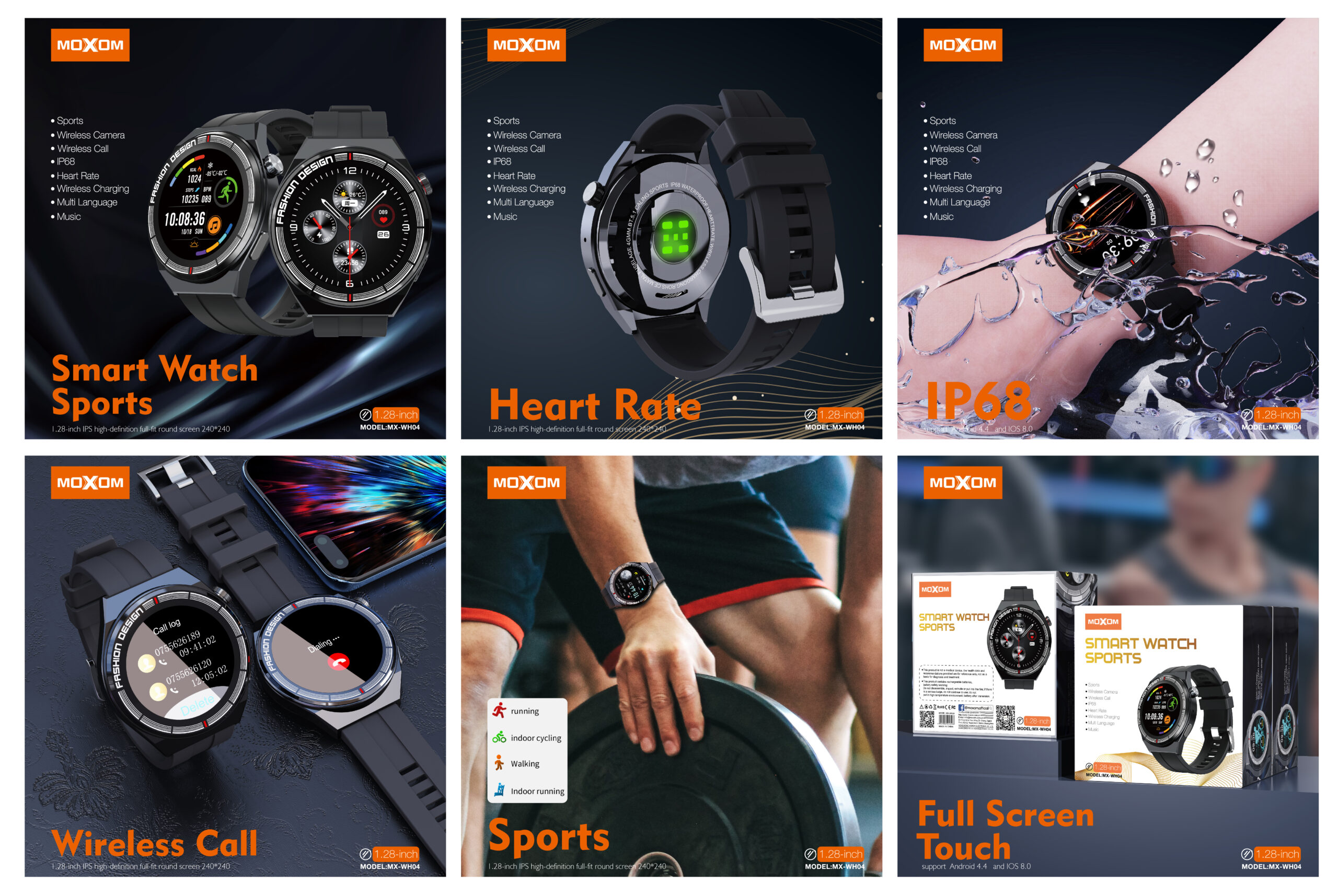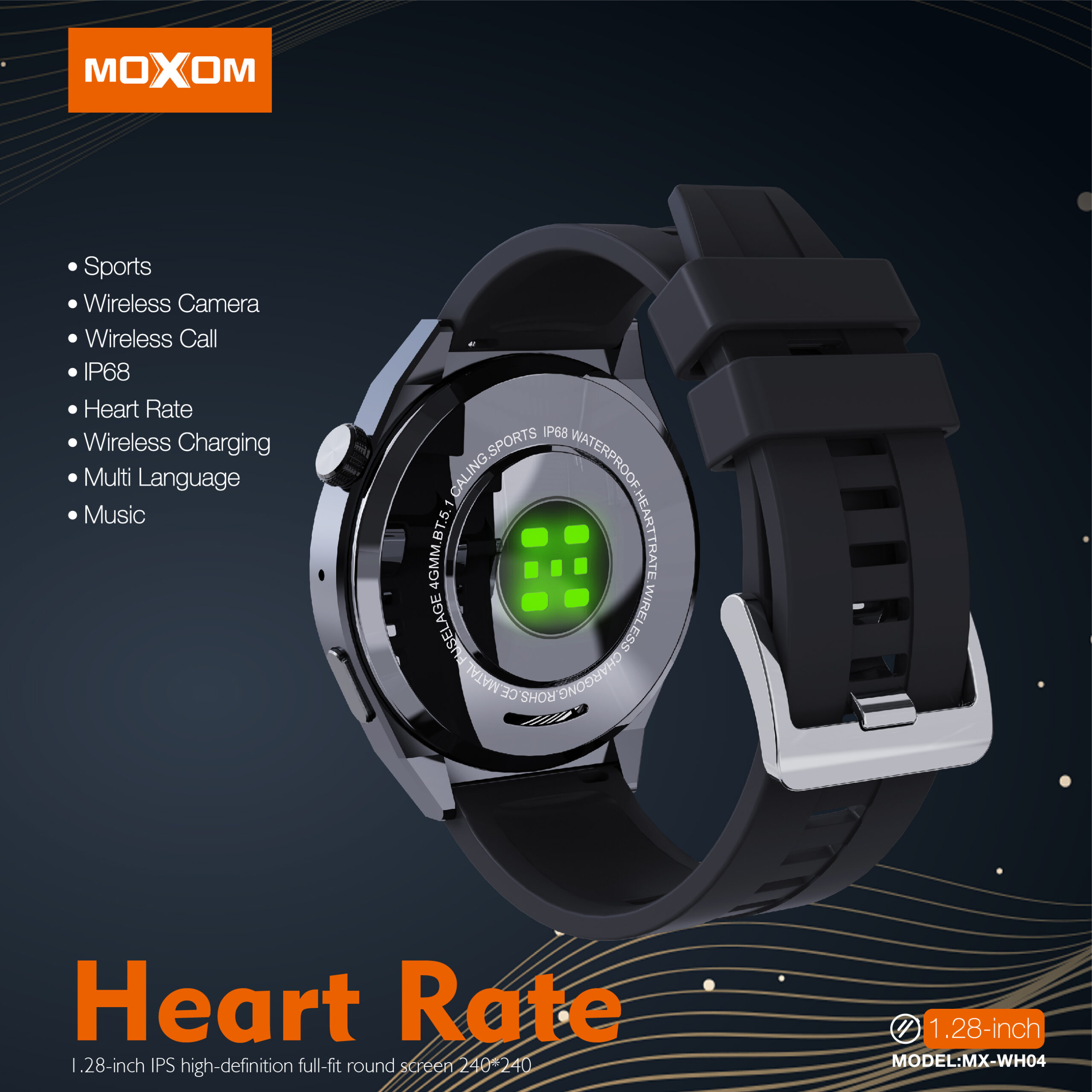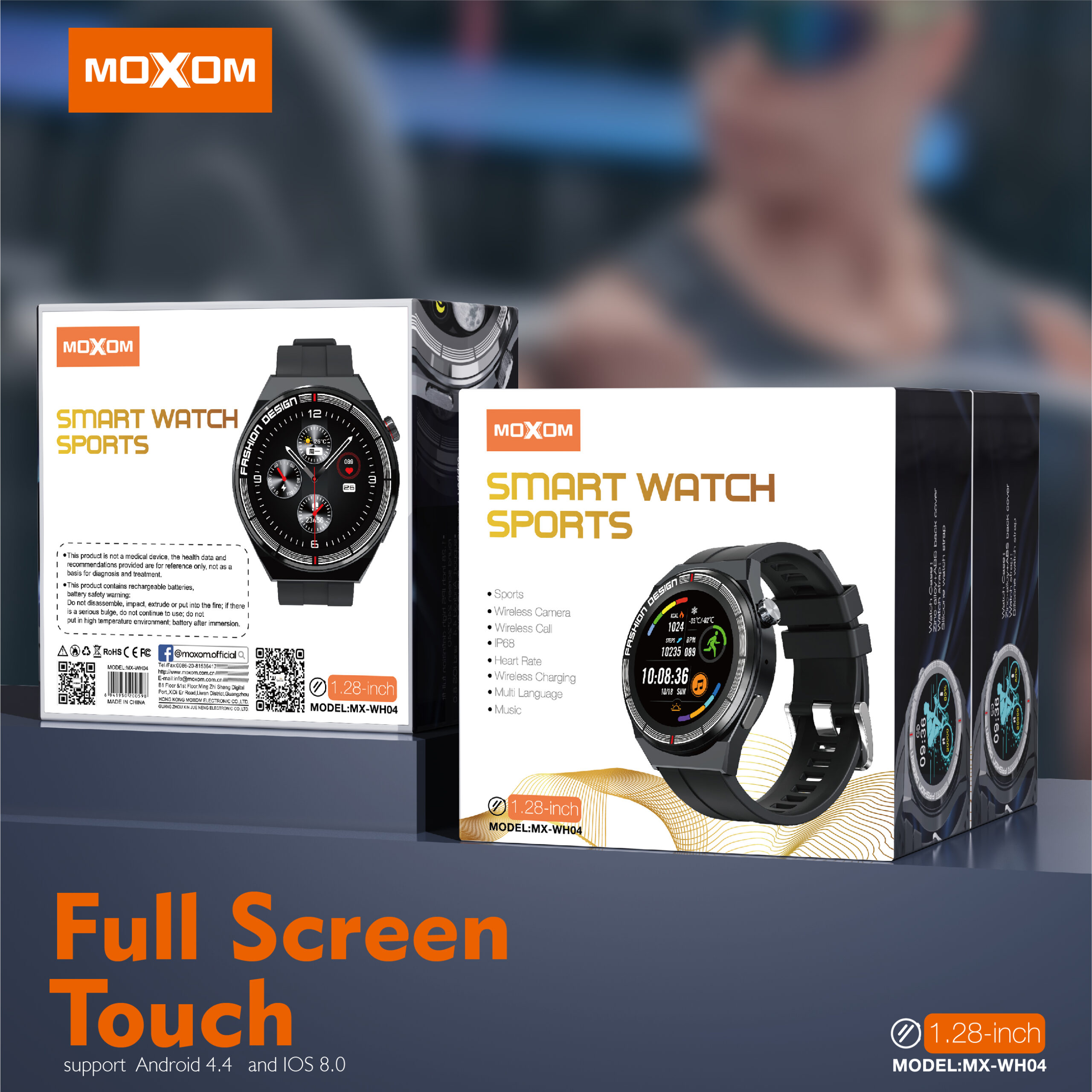 The Moxom Smartwatch Sports (MX-WH04) is designed for the active individual, combining durability with a range of smart features. Its rugged design is built to withstand the demands of sports and outdoor activities. The full-screen touch interface on the vibrant 1.28-inch display allows for easy navigation and control. Stay connected on the go with the Bluetooth call function, enabling you to make and receive calls directly from your wrist. Enjoy the convenience of wireless charging, eliminating the need for cables. The smartwatch supports multiple languages, catering to a diverse user base. It’s compatible with both Android (4.4 and above) and iOS (8.0 and above) smartphones, ensuring broad compatibility. While the image highlights Bluetooth calls and wireless charging, sports smartwatches typically include features like fitness tracking (steps, heart rate, various sport modes), sleep monitoring, notifications, music control, and more. The Moxom Smartwatch Sports MX-WH04 is a reliable companion for your fitness journey and daily life.