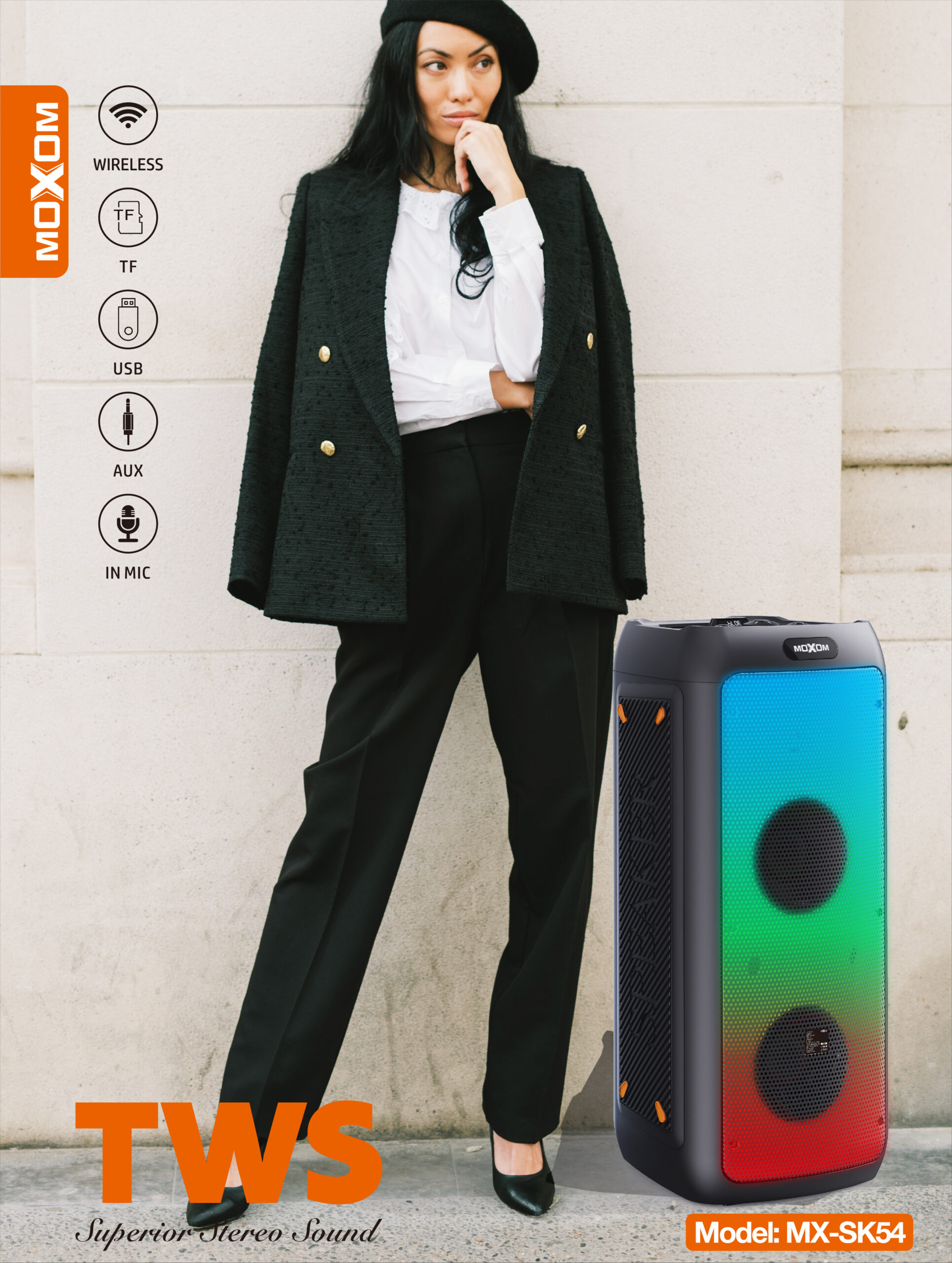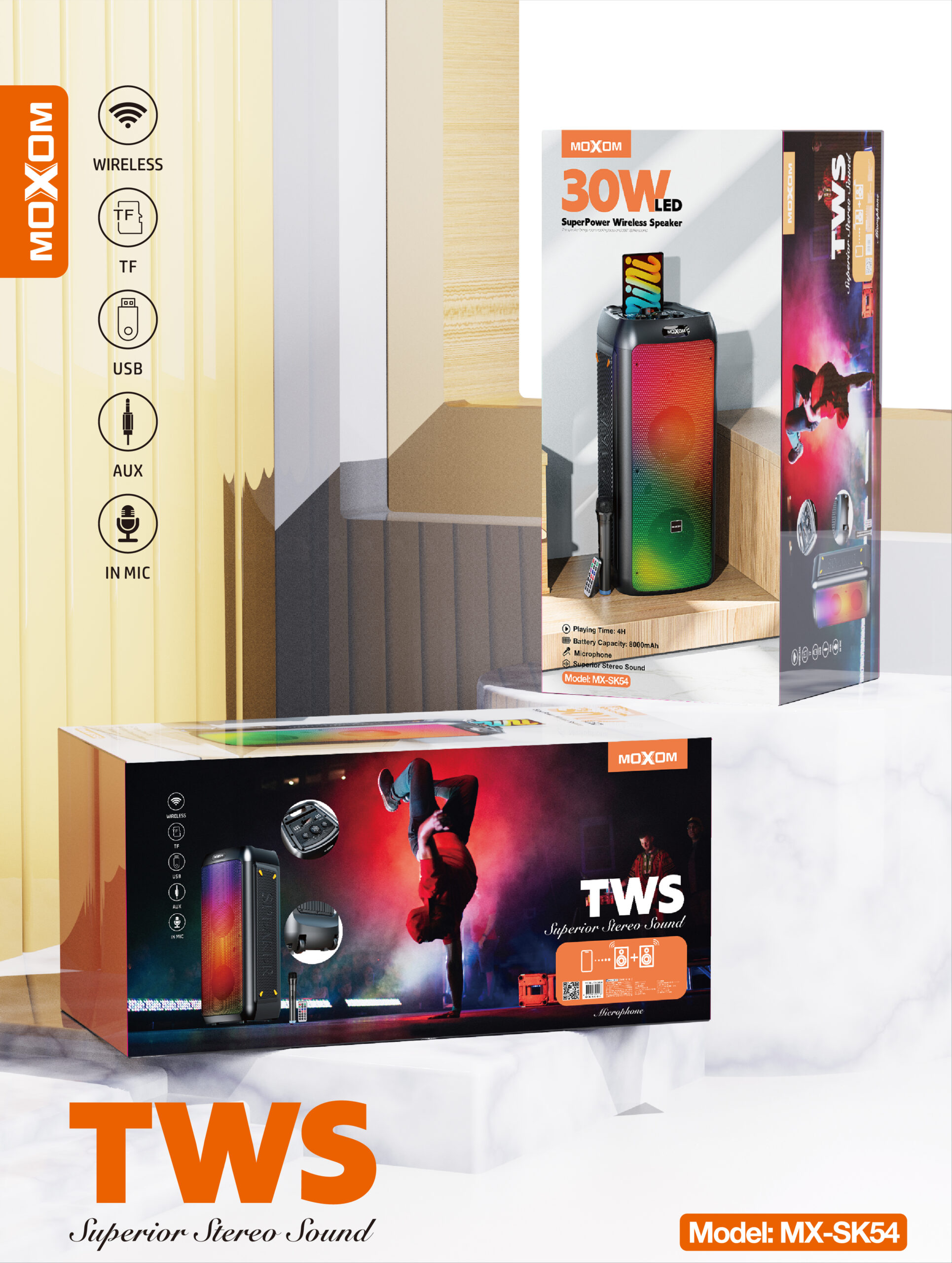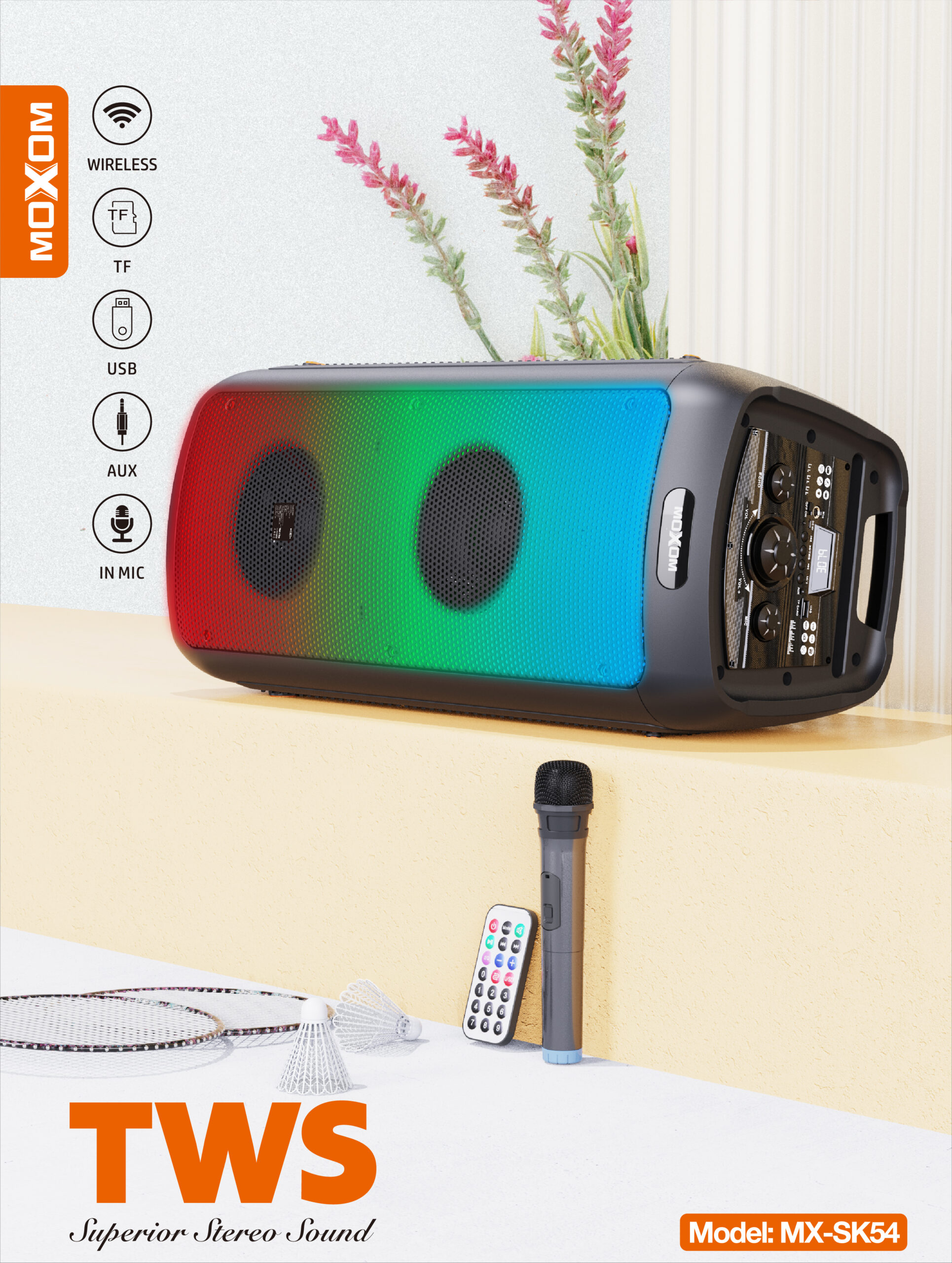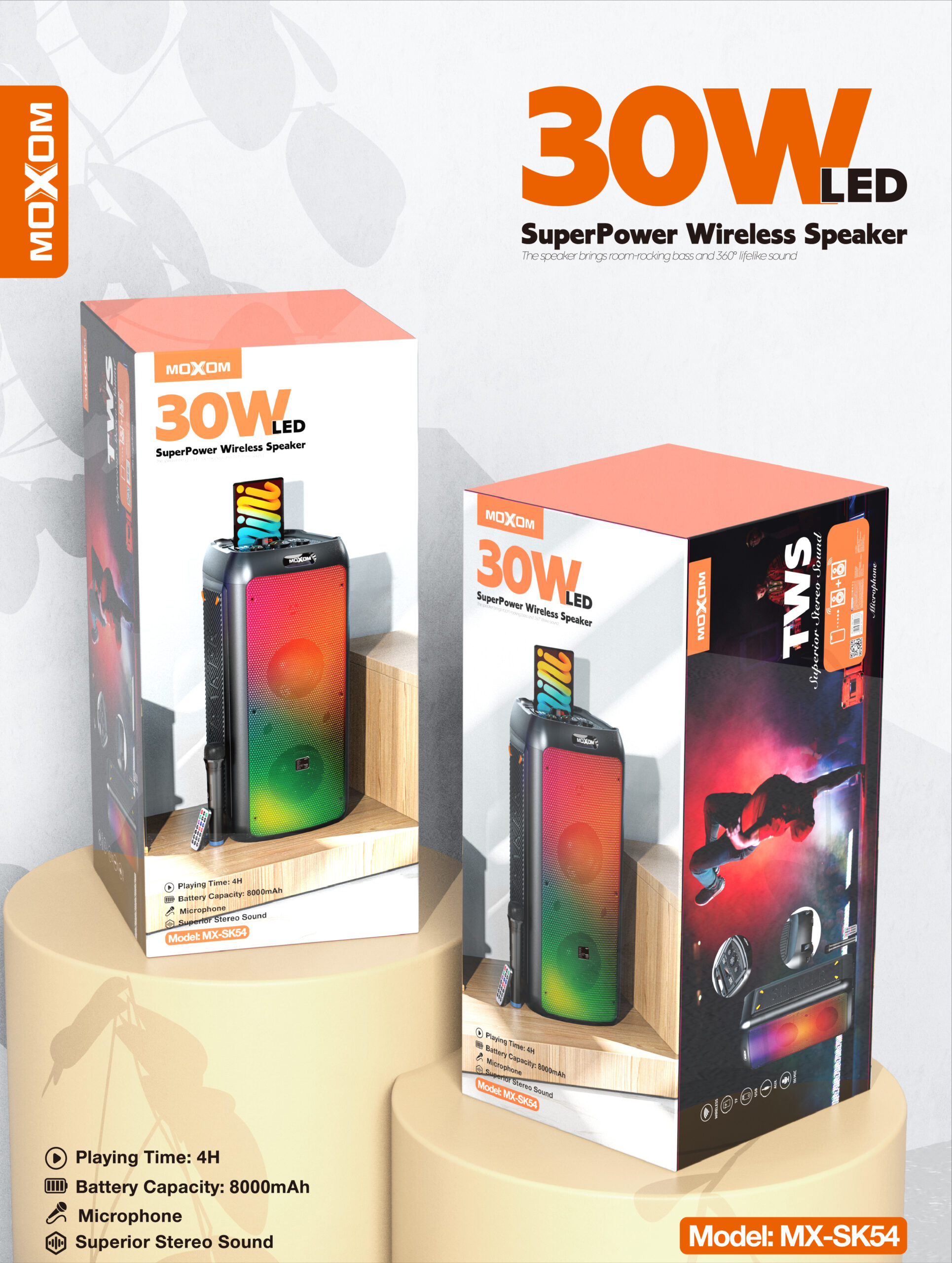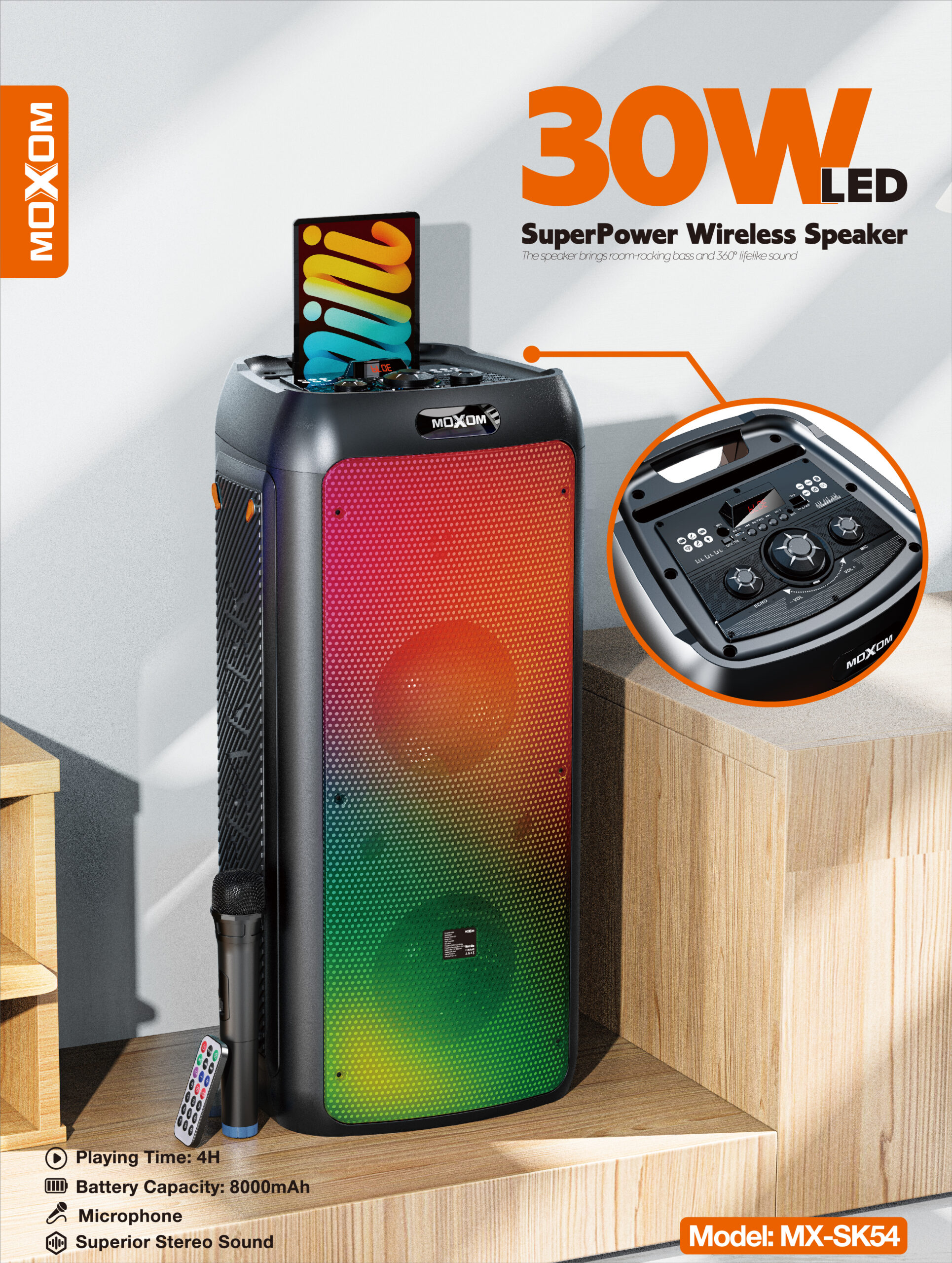 The Moxom SuperPower MX-SK54 is a vibrant 30W wireless speaker that delivers powerful sound and an engaging light show. Its built-in LED lights create colorful patterns that pulse with your music, enhancing the listening experience. The integrated microphone allows you to take calls hands-free or even enjoy karaoke sessions. With TWS (True Wireless Stereo) functionality, you can pair two MX-SK54 speakers for an even wider and more immersive stereo soundstage. Enjoy high-quality audio with superior stereo separation. The speaker boasts a long playing time of up to 4 hours on a single charge, thanks to its large 8000mAh battery capacity, ensuring your music keeps playing. Its portable design makes it easy to take the party with you wherever you go.